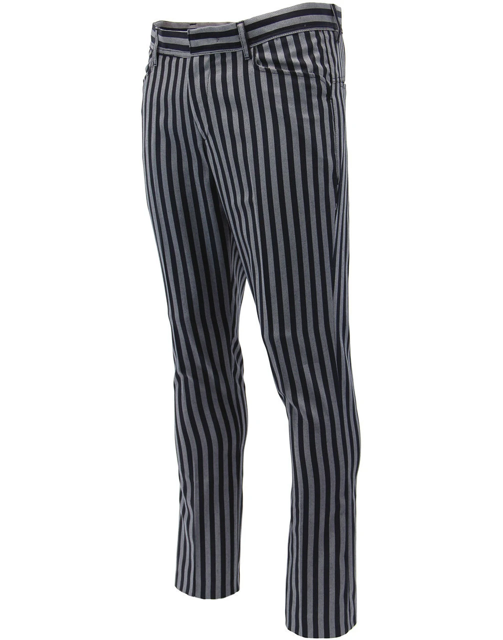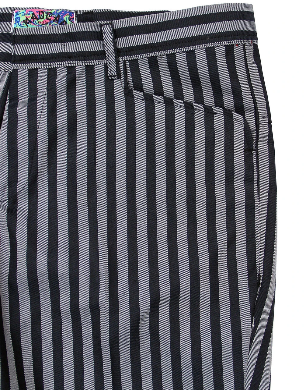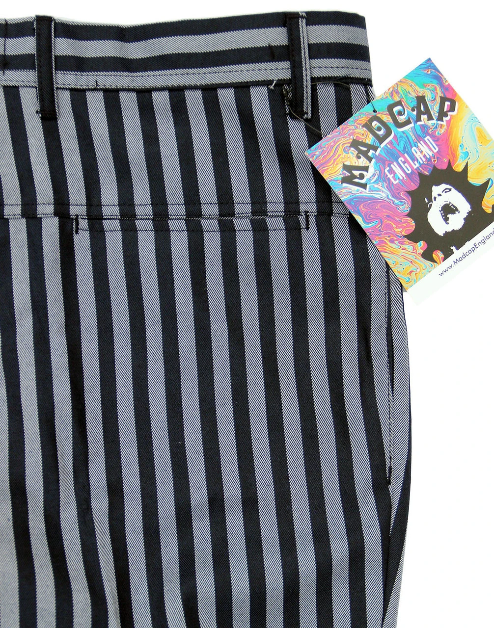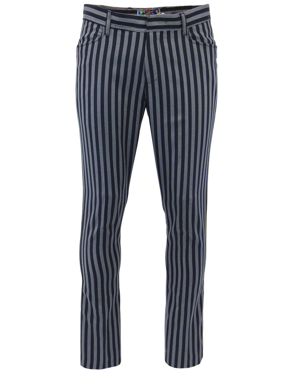 Key Points: Madcap England ‘Meadon’ boating stripe slim leg trousers with frogmouth pockets.