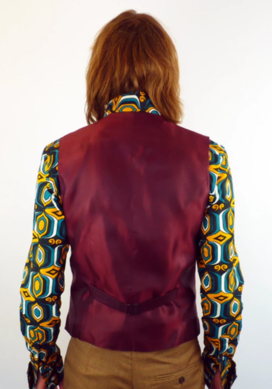 MENS RETRO SIXTIES MOD DOGTOOTH V-NECK WAISTCOAT TAILORED by MADCAP ENGLAND – Mens taupe and brown Retro waistcoat with cool Vintage deep burgundy colour twist. Sixties Mod covered buttons, single breasted V-neck style. Two pockets to sides, contrast burgundy back panel.